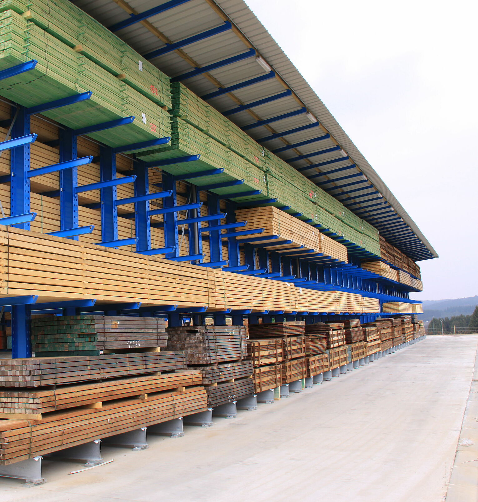 For all goods that do not necessarily have to be stored in a hall, outdoor storage is an option. This provides additional storage space. The prerequisite for this is the choice of the right storage systems. Cantilever racks for outdoor use are rustproof and thus optimal storage systems for storing many long goods such as wood. The steel profiles of the cantilever uprights and arms are hot-rolled and very elastic, but still have a high load-bearing capacity. All load-bearing components of the racking are hot-dip galvanised and thus resistant to weathering.
